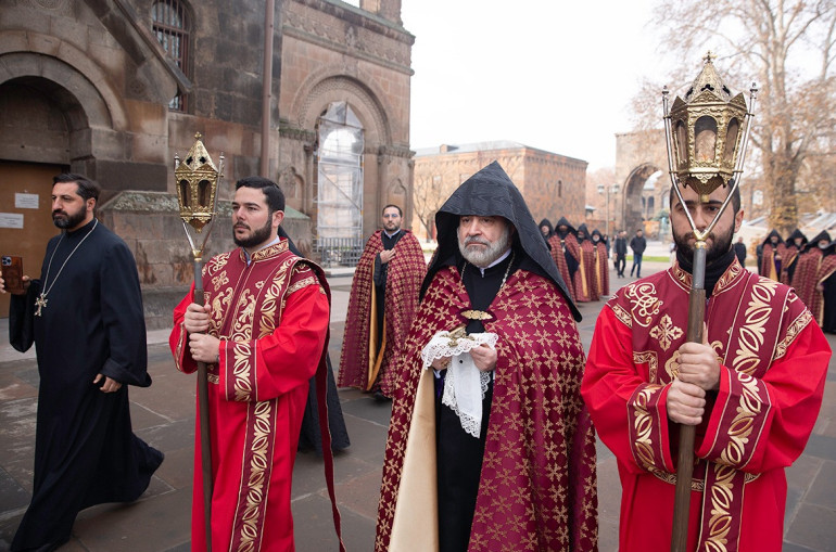 թափորը շարականների երգեցողության ներքո Մայր Աթոռ Սուրբ Էջմիածնի Սրբոց Հրեշտակապետաց